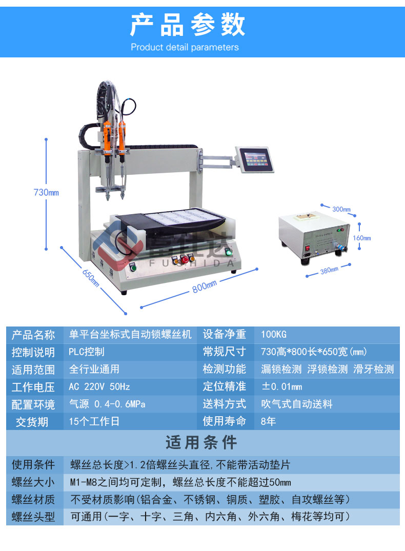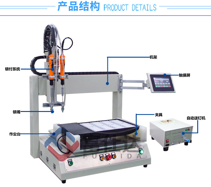 富仕達單平臺自動鎖螺絲機是指單平臺坐標式自動鎖螺絲機,通常用在面積較大產品,如:寫字板、大家電、天花吊頂、大型玩具及大型LED模組等。